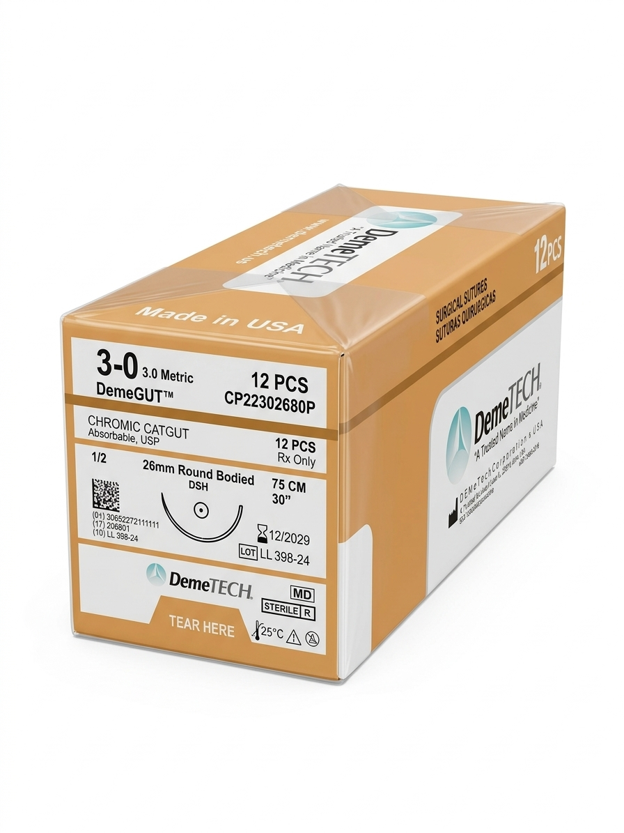 La sutura Chromic Catgut DemeGUT 3-0 es una sutura absorbible tratada con sales de cromo para prolongar su tiempo de absorción y mejorar la resistencia en el tejido. Está diseñada para procedimientos quirúrgicos que requieren soporte temporal durante el proceso de cicatrización.
