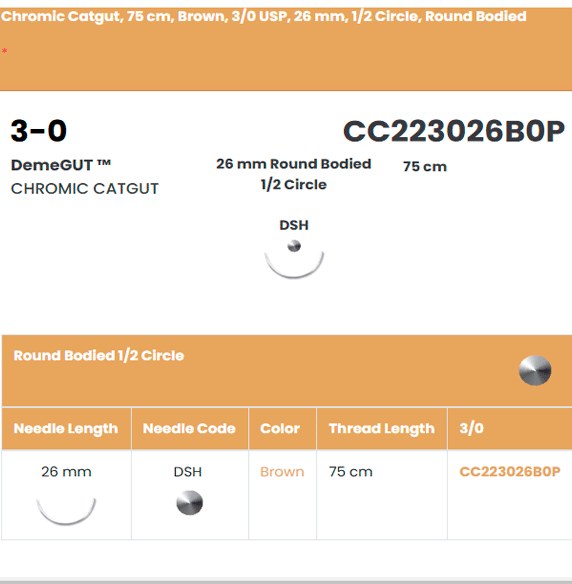 Sutura de Catgut cromico calibre 3-0 con aguja SH. Para cirugía de tejidos finos, vascular periférico y oftalmología.