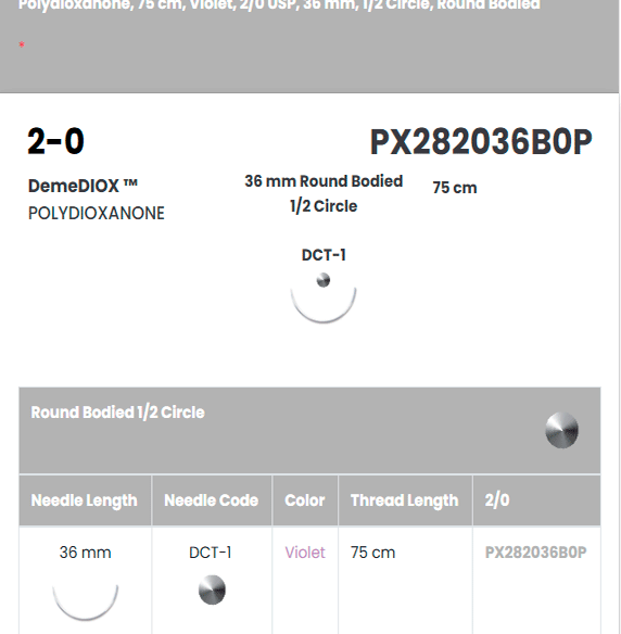Sutura PDS calibre 2-0 con aguja CT-1. Para cirugía pediátrica y ginecológica