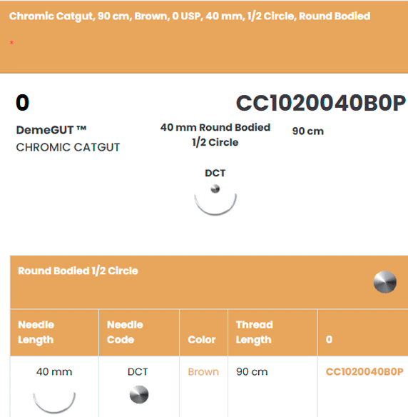 | Sutura de Catgut cromico calibre 0 con aguja CT. Versátil para cirugía general y obstétrica. Excelente retención de tensión. Color Marron |