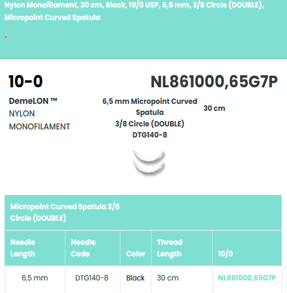 | Sutura de Nylon calibre 10-0 con aguja redonda doble TG140-8. Para microcirugía oftálmica, procedimientos de retina y cirugía de alta precisión. Diámetro ultradelgado. |