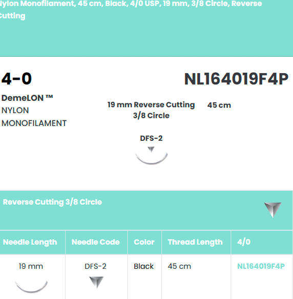 Sutura de Nylon calibre 4-0 con aguja FS-2. Indicada para cirugía facial, vascular fina y cierre estético.