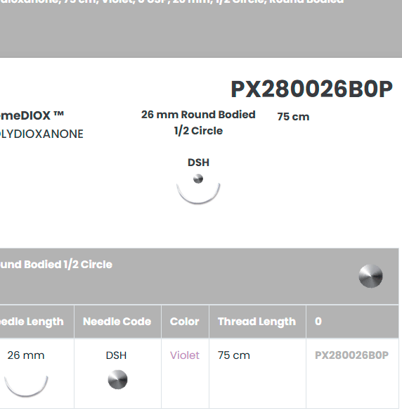 | Sutura absorbible de PDS (Polidioxanona) calibre 0 con aguja SH. Mantiene resistencia hasta 6 semanas y absorción completa en 180-210 días. Indicada para cierre de fascia, tejidos con cicatrización lenta y cirugía ortopédica. Color violeta. |
