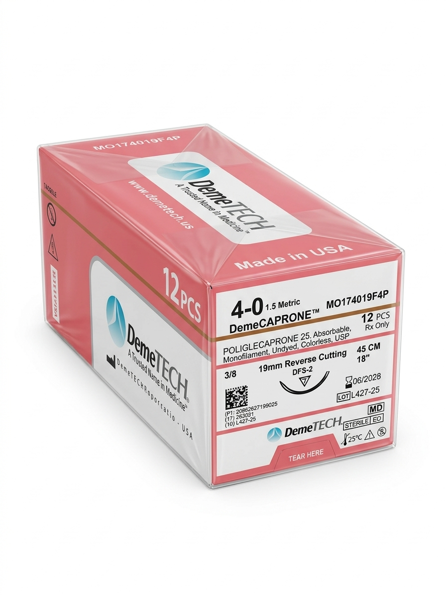 La sutura DemeCAPRONE 4-0 está fabricada con polyglecaprone, un material sintético absorbible diseñado para proporcionar excelente manejo, suavidad y mínima reacción tisular.