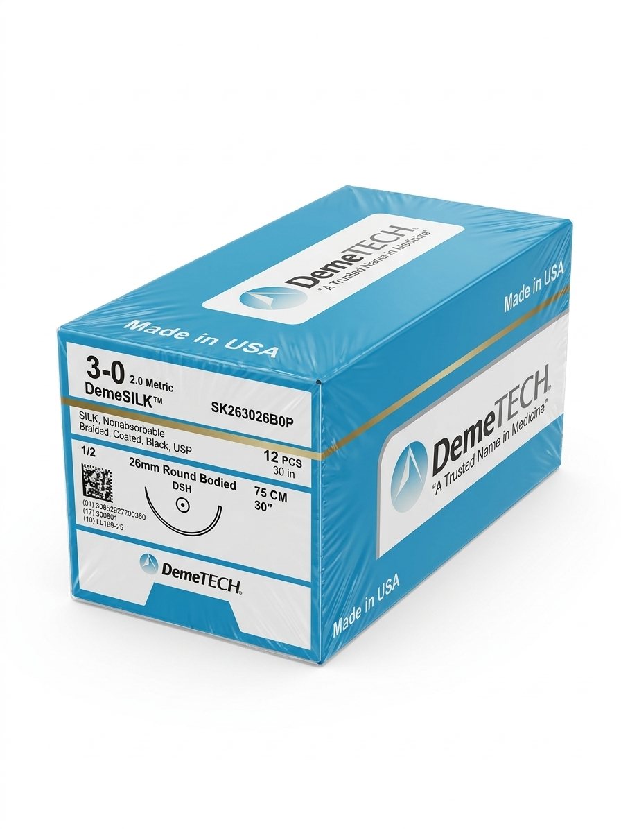 La sutura DemeSILK Silk 3-0 es una sutura no absorbible fabricada en seda trenzada, ampliamente utilizada por su excelente manejo, flexibilidad y facilidad para realizar nudos seguros.
